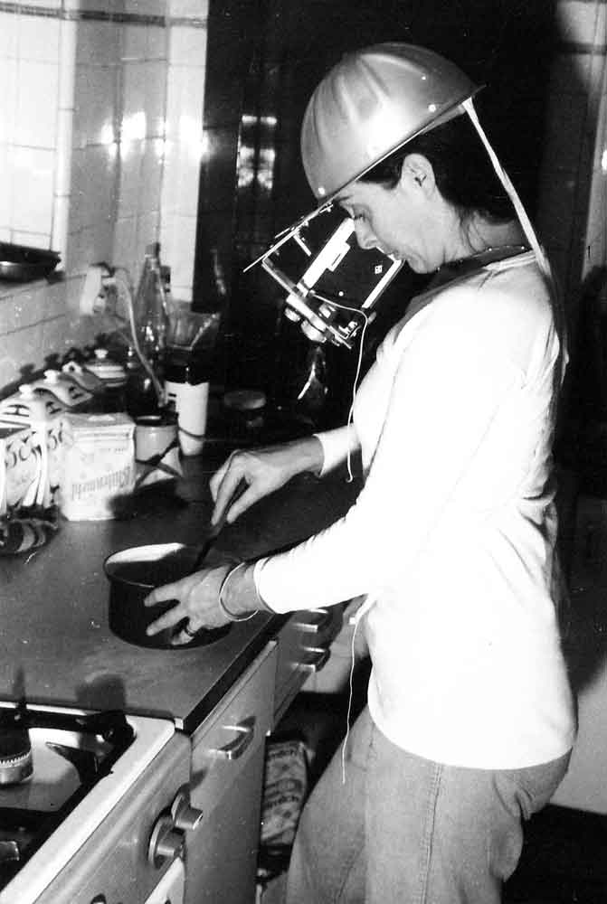 Foto: Margaret Raspé mit Kamerahelm, ca. 1974