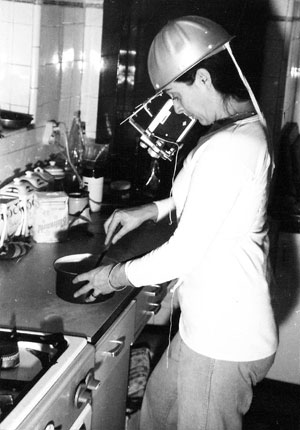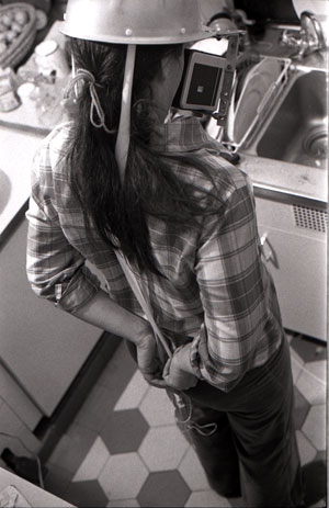 Margaret Raspé mit Kamerahelm, ca. 1974
