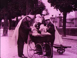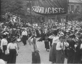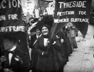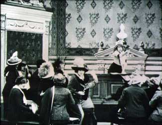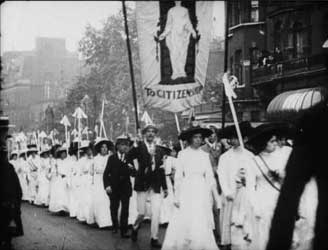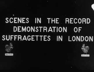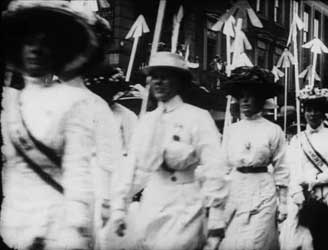 Militanzen Die radikale englische Womens Social Political Union (WSPU) unter der autokratischen Leitung von Emmeline Pankhurst kämpfte seit 1903 für politische Frauenrechte. Sie organisierte Demonstrationen, Kampagnen und unzählige Petitionen. Um 1910 radikalisierte sich das Vorgehen der WSPU. Ihre Mitglieder benutzten Militanz und Gewalt zur Herstellung von Öffentlichkeit; die Repression wurde daraufhin stärker. Viele Komödien beziehen sich auf die englische Bewegung der WSPU. Die Non-Fiction-Filme zeigen ein geordneteres Bild: Lange Aufmärsche in weißen Kleidern, mit den Insignien des Holloway-Gefängnisses und mit Transparenten wie „Taxation without Representation is Tyranny“. In Les Femmes députées kandidieren Madame Dupont und Madame Dubois gegeneinander, im strengen Tweedkostüm und mit gestreifter Krawatte. Reden, Plakatierschlachten, Wahlwerbung bei den Gemüsefrauen und Parlamentsdebatten, all dies habe zur Folge, dass die Ehemänner mit Haushalt und die Babies ohne Obhut alleingelassen sind, und es diesen Ehemännern einzig bleibt, sich mit ihren männlichen Leidensgenossen - mit Schleifen der Pariser Ammen an ihren Zylindern - zum Babyvergleich zu treffen... Ein geplagter Ehemann träumt noch 1918, als Premierminister drakonische Strafen gegen aktionistische Suffragetten zu erlassen, um sie in ihrer Militanz zu zermürben (Milling the Militants), doch mit dem Beginn des Ersten Weltkriegs stellten sich die meisten Suffragetten in den Dienst der nationalen Kriegssache und verzichteten darauf, das Wahlrecht zu fordern. Der frühe Anti-Kriegsfilm Dans le sous-marin endet mit einer Allegorie: Die Friedensgöttin Pax wacht über die Zerstörung der Waffen. Die Parlamentsfrauen Scenes in the Record: Demonstration of Suffragettes |